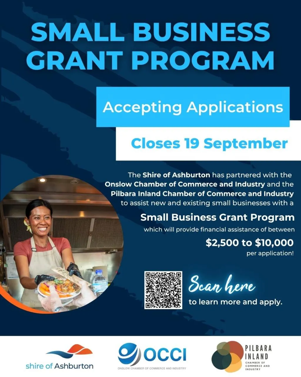 The Onslow Chamber of Commerce and Industry is proud to partner with the Shire of Ashburton and the Pilbara Inland Chamber of Commerce and Industry to deliver the Small Business Grant Program, supporting both new and existing small businesses across our region.