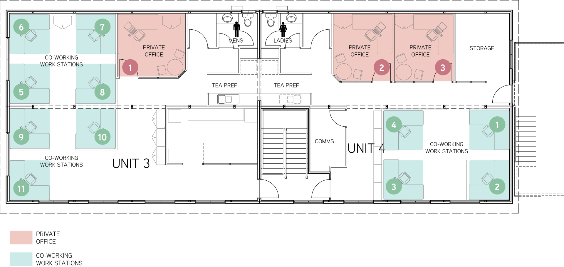 We have 11 available Co-Working Stations - all are located on the First Floor.